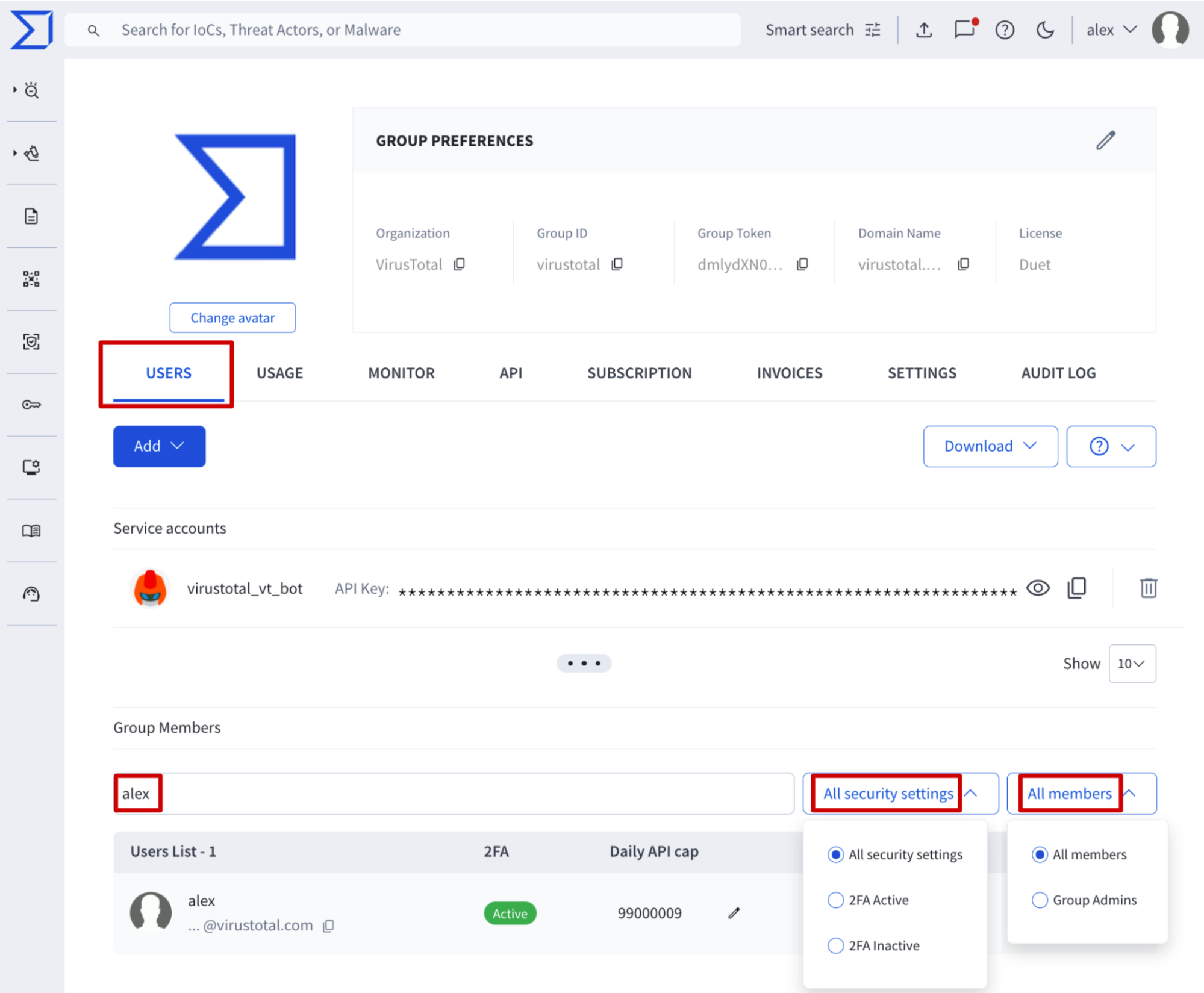VirusTotal’s premium users are split in two flavors: regular users and administrators. Administrators have additional privileges to regular users, designed to manage the VirusTotal group assigned to them.